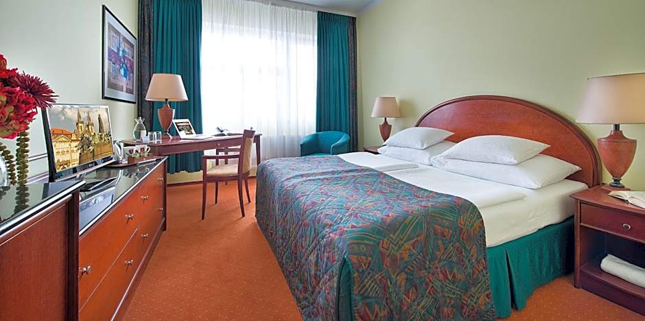 Spacious double room with kingsize bed or twin beds, work desk and bathtub.